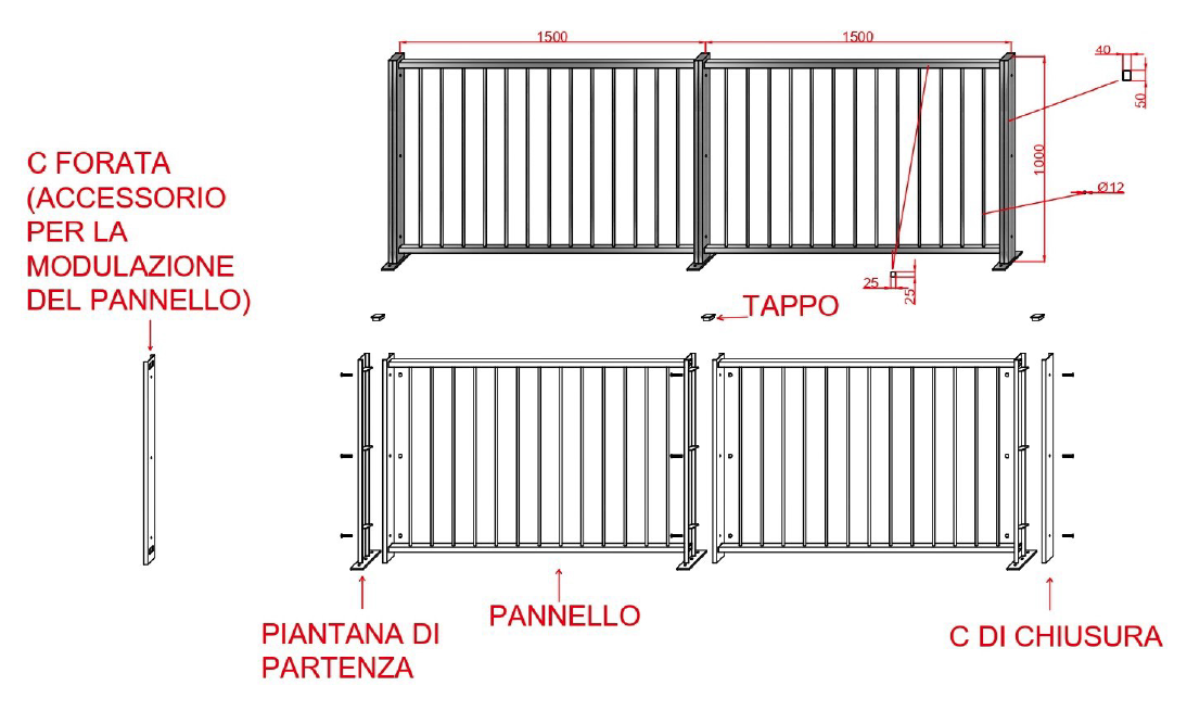 Recinzione per esterni esteticamente gradevole e leggera con un design lineare, ideale per delimitare confini, facile e veloce da installare, modulabile, in base alla lunghezza del muretto, tramite l’accessorio “c-forata”.